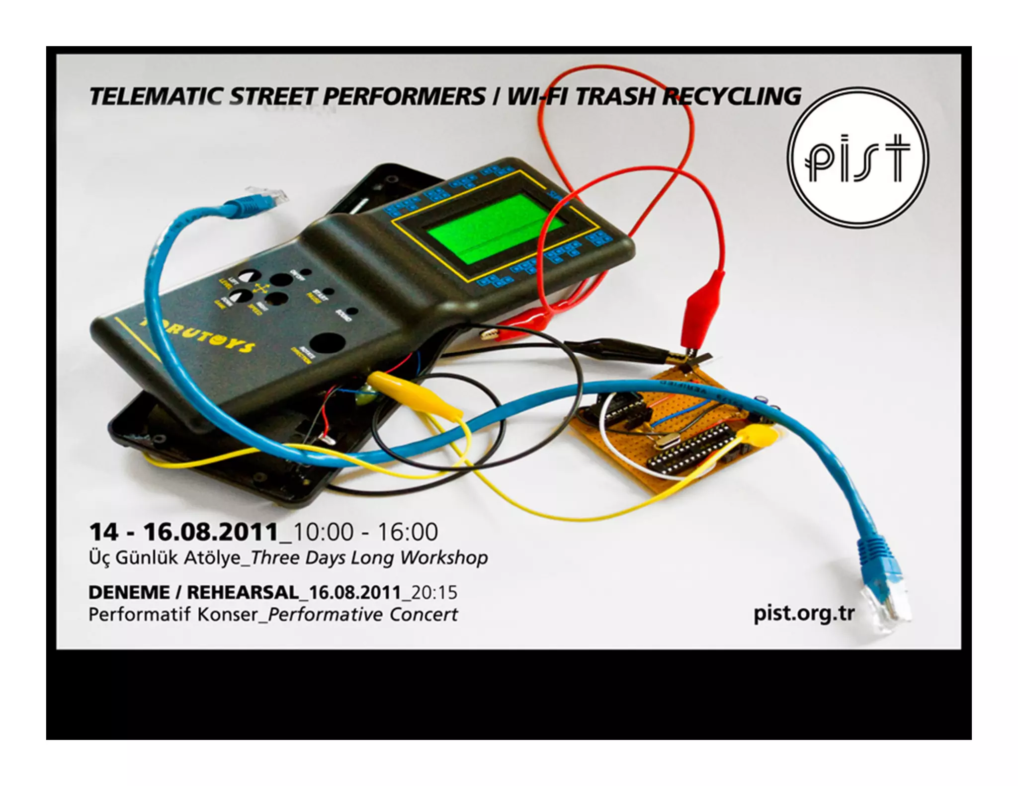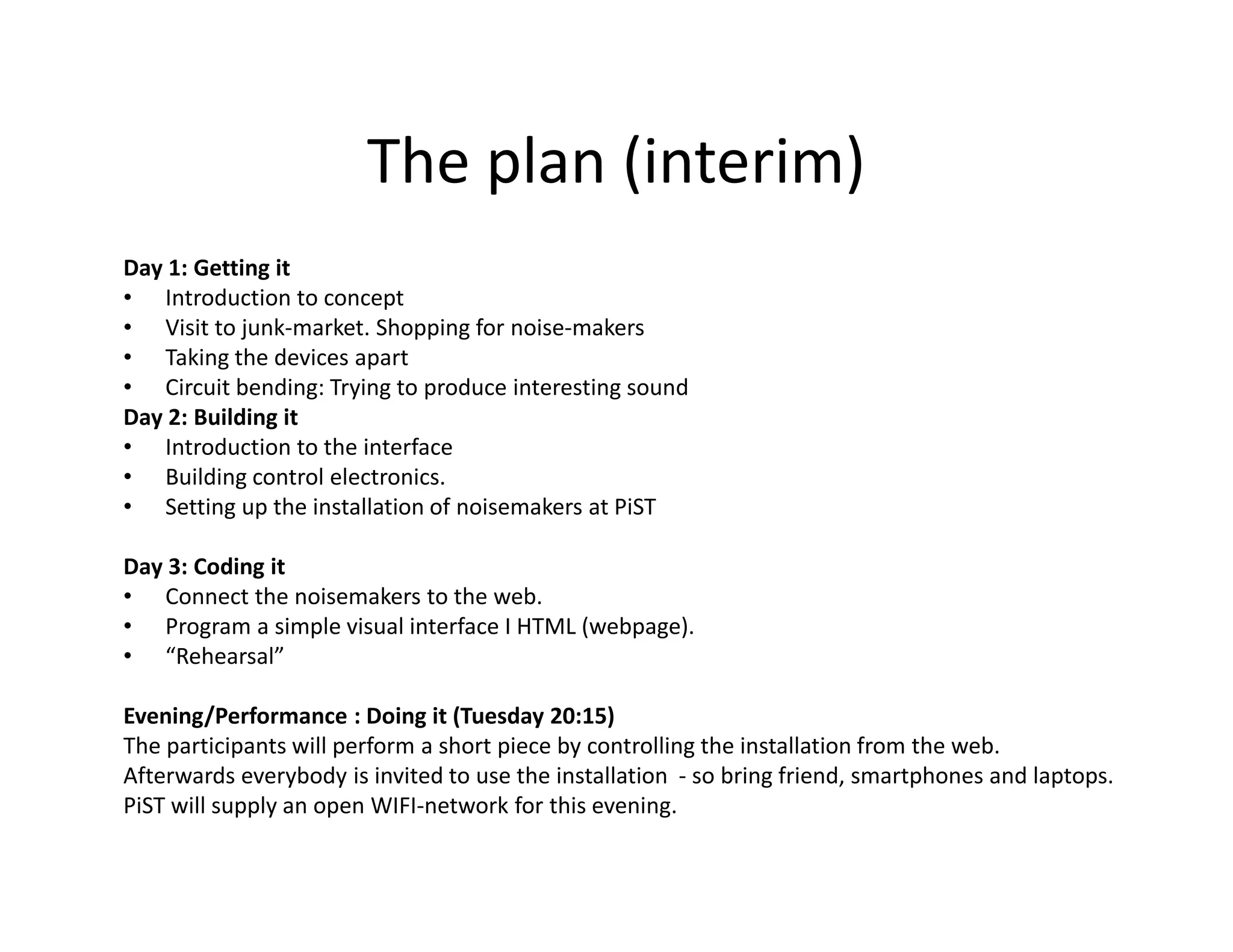 The 3-day workshop will have participants create an interactive sound installation controlled over the internet. Day 1 involves collecting sound-making devices from junk markets and circuit bending them. Day 2 is building control electronics with an Arduino and custom circuit boards. Day 3 has participants program a web interface and connect the devices to the internet. An evening performance will invite others to control the installation remotely over WiFi on their smartphones and laptops.