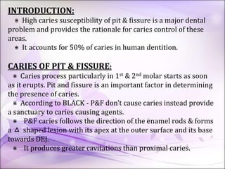 This document discusses pit and fissure sealants. It begins by noting that pit and fissure areas are highly susceptible to dental caries, accounting for 50% of caries. It then reviews the caries process in pits and fissures. Several milestones in pit and fissure sealant development are outlined, from early filling techniques to modern resin-based sealants. The document discusses the classification, effectiveness, requirements, case selection criteria, and application technique for pit and fissure sealants. Recent advances including acid-releasing and wet-bonding sealants are also summarized.