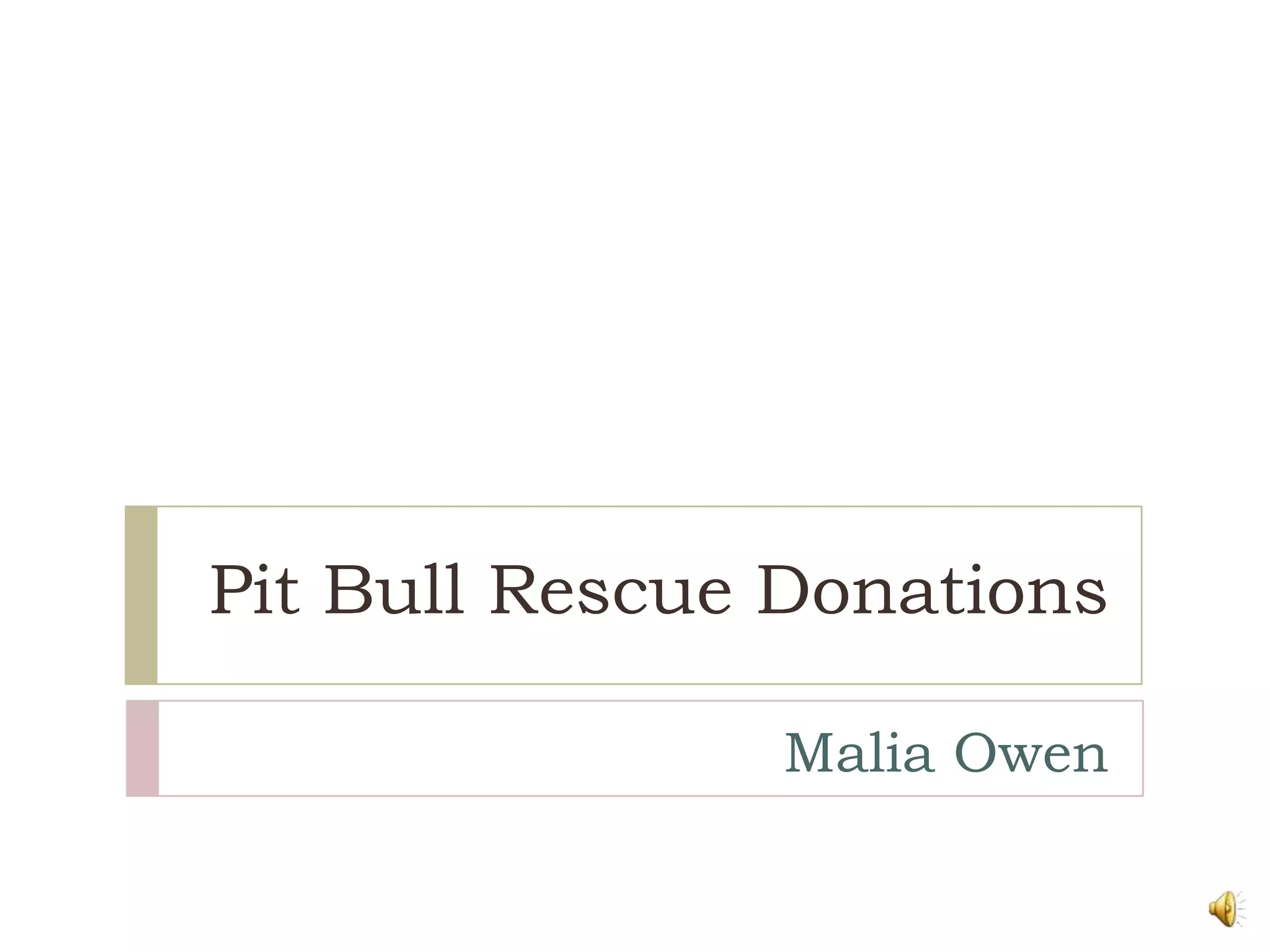 This document discusses the history and facts about pit bull rescue donations. It details that pit bulls originated from the Molossian family of dogs in England and were used for baiting until the 19th century. As immigrants traveled to the US, pit bulls served as herders, guardians, and protectors. There are three main types - the American Pit Bull Terrier, American Staffordshire Terrier, and Staffordshire Bull Terrier. The document encourages donations to organizations like Pit Bull Rescue Central as pit bulls have a bad reputation but are loyal companions that enjoy pleasing people.