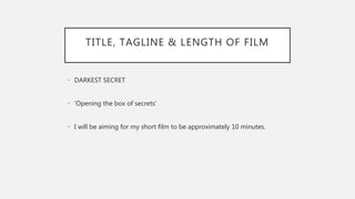This document outlines two potential short film ideas by Sarah Poore. The first film is called "Darkest Secret" and is about a woman named Kate who discovers secrets about her late husband David after he passes away. The second film is called "Lucy" and is about an 11-year-old lonely girl named Lucy who befriends a man named Harry at an abandoned bunker. Both films would be around 10 minutes and target audiences in their 20s-40s who can relate to the characters and themes of secrets, emotions, and friendship.