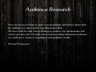 The document summarizes audience research conducted for a student horror film project. It discusses:
