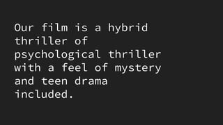 A college student returns home after being missing for a year with no memory of what happened. He experiences flashbacks to being kidnapped but doesn't know his identity or what occurred during the missing year. He tries to reintegrate into his life and solve the mystery of his kidnapping. The film will follow his attempts to piece together what happened through investigating friends and the woman thought to be involved, all while dealing with psychological and identity issues stemming from the trauma. It will appeal to a young audience through addressing fitting in and finding oneself while maintaining an intriguing mystery and thriller elements.