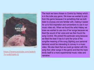 The document summarizes a pitch for a music video for an indie pop song. It discusses choosing the Halsey song "Control" for its beat and lyrics about overcoming personal demons. The pitch names the artist as "Onyx" to reflect the dark tone and references influences from Lorde and Lana Del Rey music videos. It outlines plans to contrast performance scenes in a studio with scenes conveying the song's narrative in locations like an old house. The pitch also discusses developing branding around Onyx's unique voice and signature dark plum lipstick, as well as linking music video and promotion through a consistent color scheme and logo design. It acknowledges challenges in securing filming locations, casting, and technical aspects like projections.