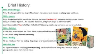 PG Tips began in 1869 when Arthur Brooke opened his first tea shop in Manchester, England. In the 1930s, Brooke launched his brand under the name 'Pre-Gest-Tea' and later abbreviated it to PG. In the 1950s, PG Tips aired its first TV advertisement. In the 1960s, it introduced tea bags which became more popular than loose-leaf tea. In 1996, PG Tips launched its patented pyramid tea bag which gave the leaves more room to move. While traditional tea sales have fallen 6% in recent years, PG Tips has strengths like its pyramid bags and involvement in sustainability initiatives, but also faces threats from increased competition and changing consumer preferences.