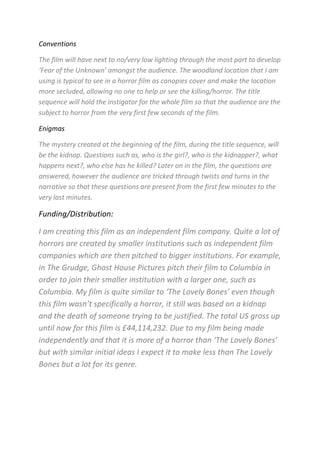 The film Into The Darkness follows a group of teenagers who attempt to stop a violent kidnapper and murderer after he kills their best friend. The opening title sequence establishes this by showing the kidnapping and murder of a young girl from the kidnapper's point of view without explicitly showing the killing. Throughout the film, compositions use high and low angles to establish power dynamics and little lighting is used to create an atmosphere of fear of the unknown. Mysteries introduced in the opening will be answered throughout the film with twists, keeping the audience questioning until the end. The independent film is pitched for distribution by larger studios similarly to other independent horror films.