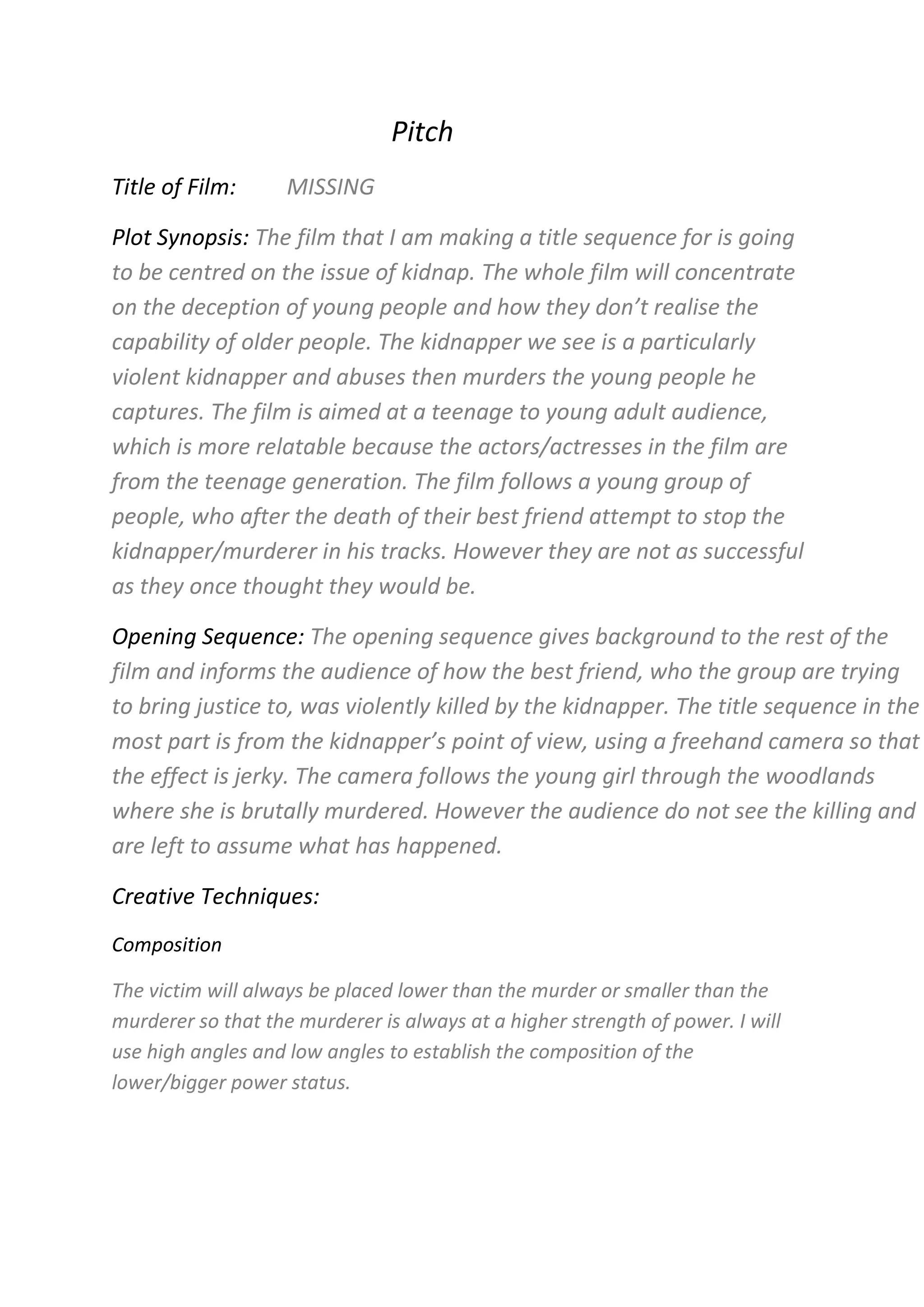 The film follows a group of teenagers who attempt to stop a violent kidnapper and murderer after he kills their best friend. The opening title sequence establishes this by showing the kidnapping and murder of a young girl from the kidnapper's point of view in a dark and secluded woodland setting. Creative techniques like low camera angles are used to convey the kidnapper's power over the victim. Mysteries introduced in the opening, like the girl's identity and what happens next, persist throughout the film to keep the audience engaged. As an independent film, it will likely be pitched to larger studios for distribution and hoped to earn over $40 million at the box office like the similar but non-horror film "The