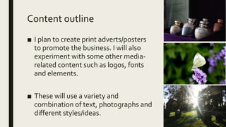 This document outlines a client project pitch to create print advertisements and posters to promote a business. The target audience is people who are grieving or bereaved. To complete the project, the creator will need a computer with Photoshop, a DSLR camera, and internet access to obtain stock images. The project will be a solo effort completed over two weeks, with meetings, photoshoots, and editing scheduled throughout.