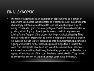 The document outlines a pitch for a psychological thriller film. It describes the main plot points where participants are recruited for a mysterious computer experiment and paid, but then find themselves trapped and subjected to unethical experiments. It then provides details on the target 16-45 year old audience, costumes depicting the characters' lives, hazmat suits and medical gowns used in experiments, potential prop and location ideas, and health and safety considerations. Poster and magazine ad concepts are included to promote the film. Animatics with and without commentary are linked.
