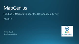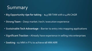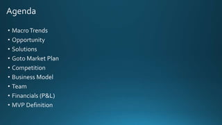 The document proposes an indoor mapping platform for hotels to provide turn-by-turn navigation for customers within properties, proximity messaging to notify customers of nearby amenities, and location sharing with groups. The platform would also enable asset tracking, spatial business intelligence, indoor geofencing, and physical security. It outlines the platform's capabilities, target personas, value propositions, pricing model, sales and marketing strategy, financial projections, and technical infrastructure requirements with a focus on an MVP.