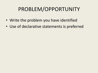 This document provides an outline for pitching a business idea to investors. It includes sections to address: the problem being solved; features of the unique solution; target customer segments and market size; the revenue model; market acceptance of initial product; competitive advantages; marketing strategy; three-year financial projections; and introducing the founding team. The overall purpose is to tell a compelling story, demonstrate market fit for the solution, and give investors confidence in the team's ability to achieve their financial projections. Practicing the pitch extensively is recommended to ensure all important points are conveyed concisely and with confidence.
