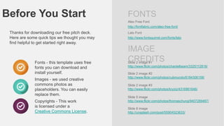The document provides tips and resources for creating a pitch deck presentation. It includes links to free fonts that can be used, credits for the placeholder images in the template slides, and information on copyright and licensing. The document also contains templates for common pitch deck slides like the title slide, problem statement, solution, advantages, market analysis, and contact slides.