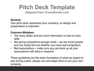 The document presents a detailed pitch deck template that outlines essential elements for a successful company pitch, including company overview, team introduction, problem and solution identification, market opportunity, marketing strategies, revenue streams, achievements, competitive landscape, roadmaps, financial projections, and funding requests. It emphasizes common mistakes to avoid while providing structured guidelines on how to effectively communicate the value of the company and its uniqueness in the market. Additionally, the document encourages personalization of the template to fit the specific needs of the company being pitched.