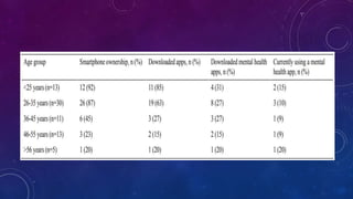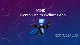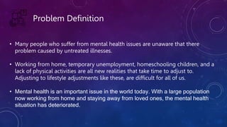 This document discusses the development of a mental health wellness app called MIND. It notes that many people are unaware their mental health issues are caused by untreated illnesses. With more people working from home due to the pandemic, mental health has deteriorated. The objective is to understand how people with mental illness use mobile phones and mental health apps. Existing apps help track moods but lack access to professionals. The proposed MIND app would provide login/registration, professional help, feedback/reviews, and be administered by logging in users who can edit/update/delete content. It has a user-centric design, aims to be expandable, easy to use, adaptive, and responsive on mobile.
