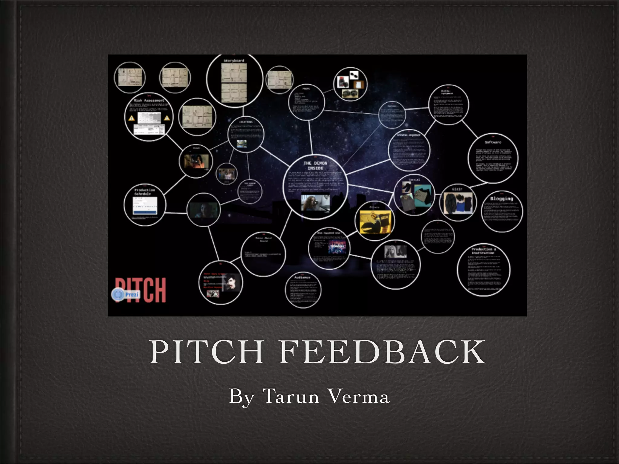 The pitch lasted 27 minutes, which was longer than the allotted 15 minutes. It included a lot of detail through pictures, videos, and music. The feedback was that the planned film opening was too long at 2 minutes and some ideas were too extreme. However, the presenter was able to improvise and explain how they would simplify the opening to introduce characters and set the scene in a shorter time. The presenter learned from the feedback that they needed a concise opening rather than one with too many details for the audience.