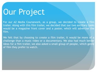 - The group decided to create a film trailer for their media coursework and chose a romantic genre after surveying audiences.