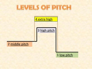 The document discusses the use of tone and pitch in speech. It notes that tone indicates the speaker's gender, age, and emotional state. It defines four levels of pitch - low, middle, high, and extra high. Tone can express emphasis for emotions like fear or surprise. Lines above or below words indicate the pitch or tone of the word - high, normal, or low. Tone usually changes between syllables but can also change within a syllable. There are two main intonation patterns - rising-falling and rising, which refer to the movement of pitch on the last accented syllable.