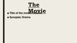The movie pitch proposes a short drama film titled "Closure" running 4-5 minutes. It would tell the story of two characters, Cycles and Emma, reminiscing on a bench about their past. An argument ensues where truths are revealed, leading them to go their separate ways with closure. The purpose is to get recognition and build a portfolio to further the director's career. The theme is how letting go of someone can improve your life over time. It provides character backgrounds and outlines pre-production plans like a production schedule and budget, as well as the target teenage and young adult audience.