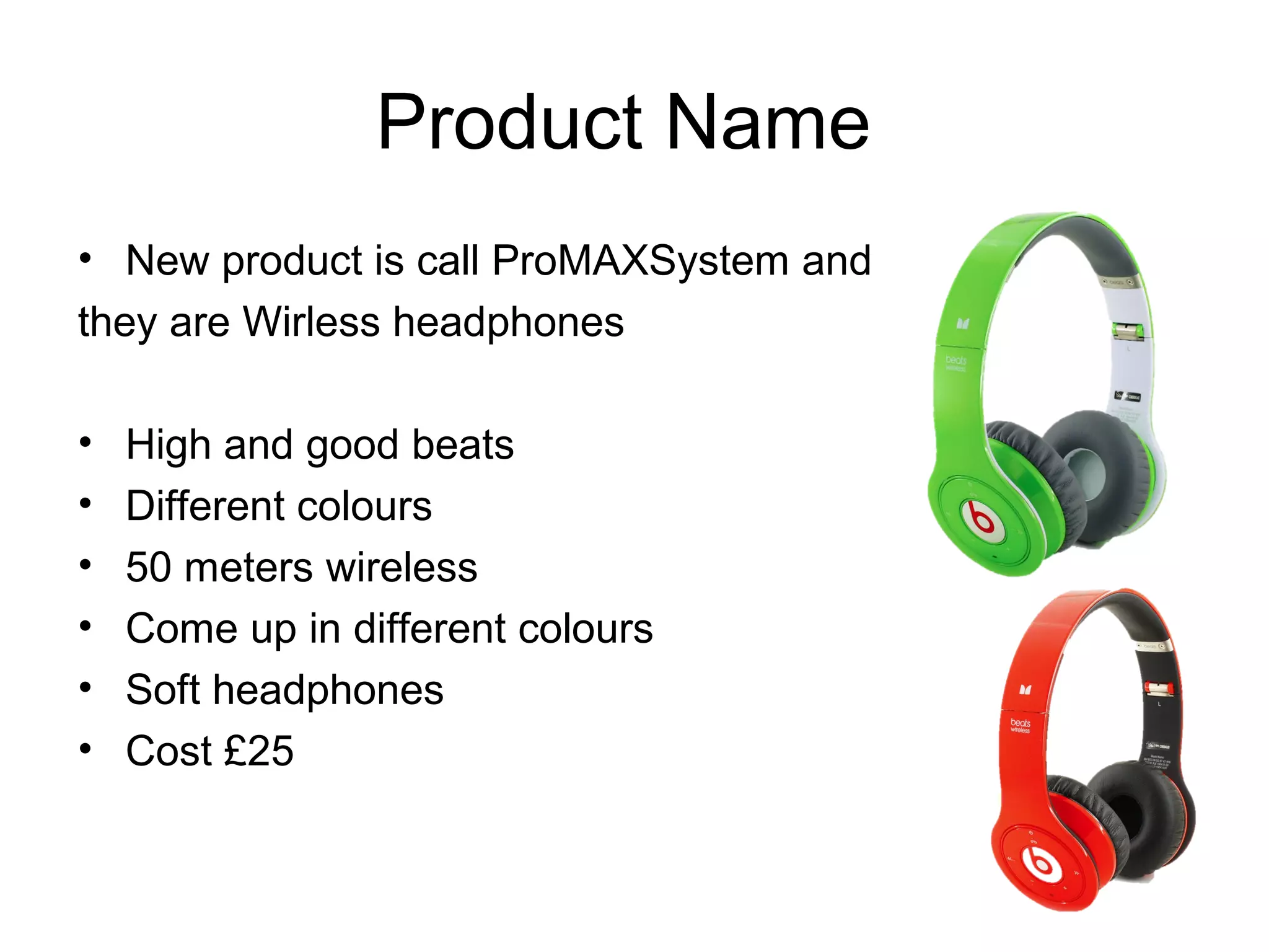 This pitch presentation introduces the ProMAXSystem wireless headphones. The key points are that they come in different colors, have a wireless range of 50 meters, soft ear cushions, and a cost of £25. The presentation also includes plans for recording a practice TV advertisement before the final deadline and details feedback from potential customers who feel wireless headphones would enhance their listening experience. It proposes that the headphones would be a good fit for Samsung and outlines the technical resources, constraints, and limits of producing the advertisement. The target audience is identified as 17 to 21-year olds who would spend around £30 and be drawn to the comfort and quality of the headphones.
