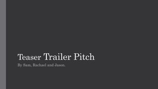 This document proposes a teaser trailer pitch for a mystery drama film about two reporters who are told they have 24 hours to live by an online group. The trailer will show the reporters receiving the threat, arguing with each other in a panic, and one appearing injured at the end. Posters and magazine covers will emphasize the characters and mystery without revealing the plot. The target audience is males aged 15-34 from a lower middle social class.