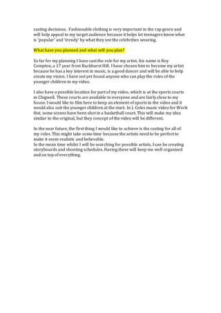 The document outlines a pitch presentation for a music video production. It will feature the artist J. Cole and follow two children growing up to become him and the girl in the song. Generic conventions like camera angles and props will be used to appeal to the target rap audience. The presentation outlines that the main artist has been cast, and a basketball court location secured. Future planning includes casting the child roles and creating storyboards and schedules.