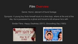 The pitch presentation proposes a horror film in the found footage genre about a boy stuck in a time loop where he is possessed each day and forced to kill whoever he is with. It describes the main character and his friend, as well as promotional ideas including emphasizing the time loop theme and the protagonist's forced acts of violence across marketing materials. The presentation also includes concepts for a teaser trailer, poster, and magazine cover that feature the main character and hint at supernatural elements and the time loop narrative.