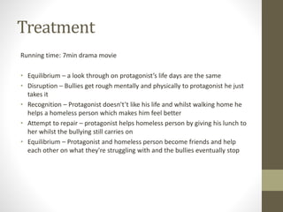 This document provides a treatment and production details for a 7-minute drama film called "Life". The film tells the story of a protagonist who is bullied at school and hates his life. One day, he helps a homeless person he meets, which makes him feel better. They become friends and help each other deal with the struggles they face. The treatment discusses the film's style, similar films, characters, locations, budget, and target audience. The goal is to relate the issues of bullying and homelessness to viewers and show that there are people who can help.