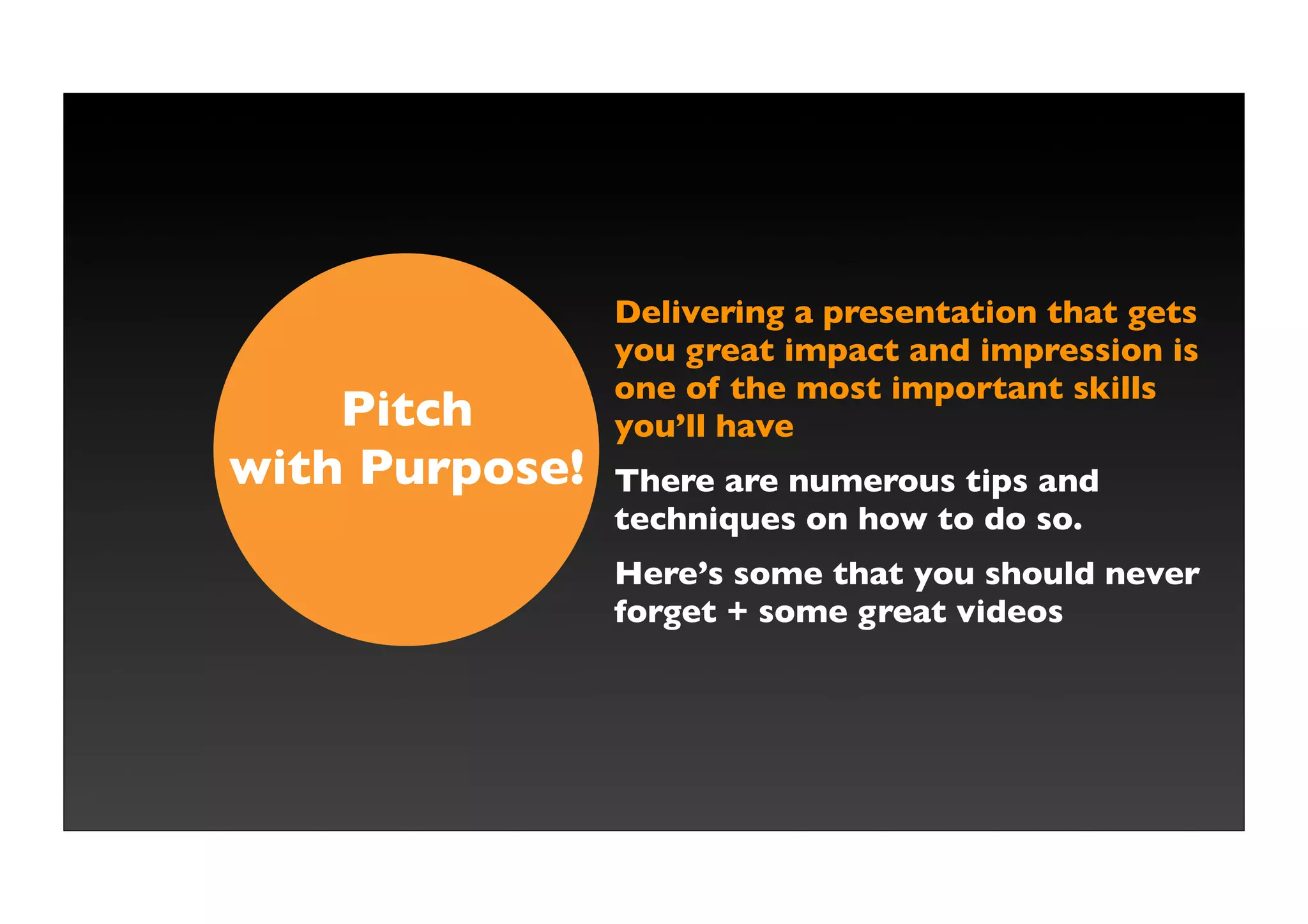 This document provides tips for delivering impactful presentations. It emphasizes that pitches should focus on the audience's needs and interests rather than the presenter. Presentations should have a clear focus, logical flow, and use visual aids to guide the audience. The key is providing the right amount of concise information without overloading the audience. Presenters should show passion and enthusiasm to energize their audience. The document recommends watching several short videos from experts on public speaking and pitching to further improve presentation skills.