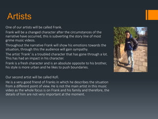 The document outlines plans for a grime music video featuring the artist "Frank". It will tell the story of Frank dealing with a tragic event from his past that has changed him. The video will include flashbacks showing a younger Frank and how he has been impacted by what occurred. It will have a serious tone to evoke empathy from audiences and subvert expectations for typical grime music videos.