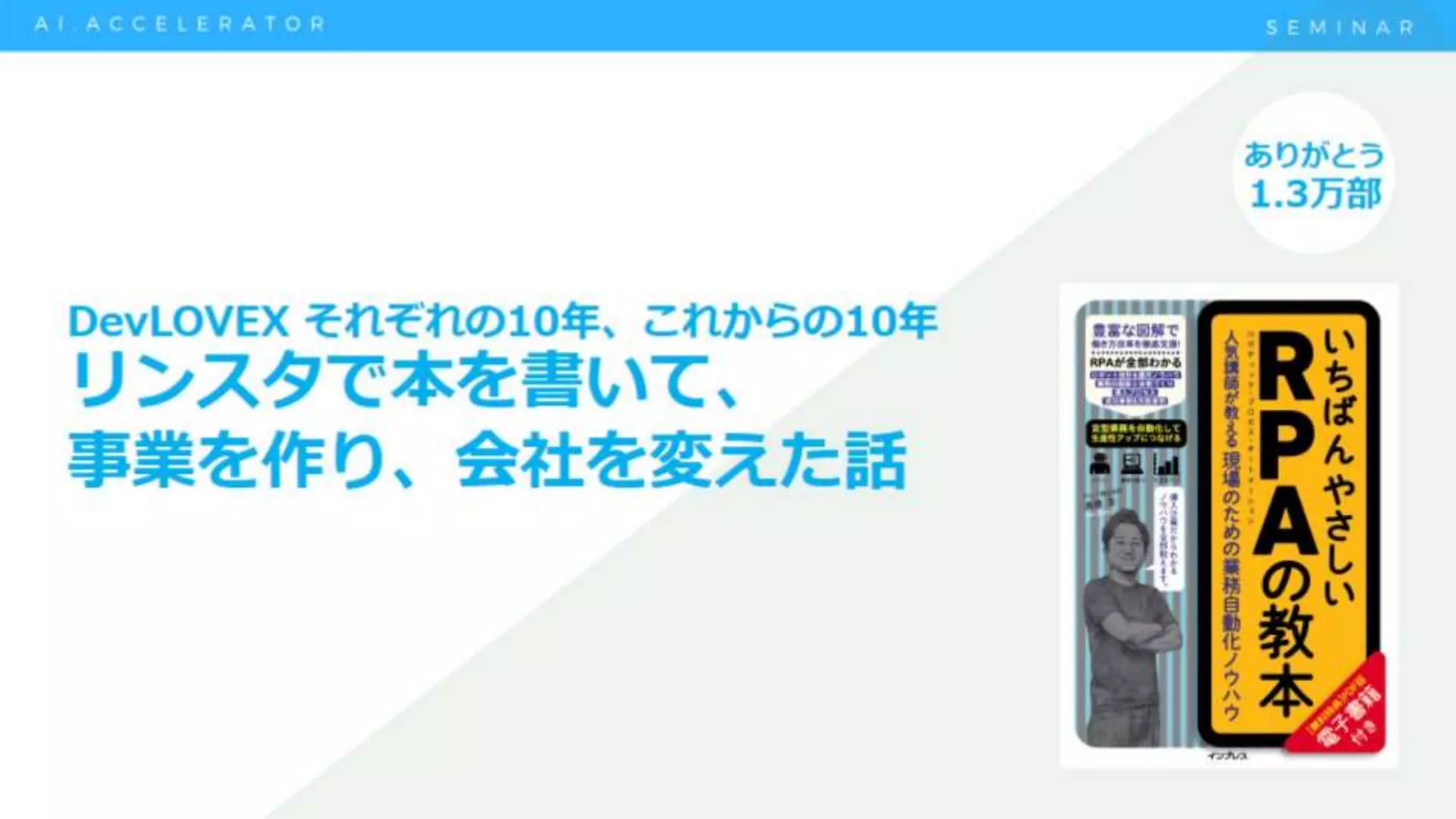 DeveloveX 作る人のコミュニティdevlove10周年を祝いまして50人くらい登壇するお祭りです。 何か新しいことをやろうとしているあなたが1歩めを踏み出せるお話をしようと思います。 devloveX https://devlove.wixsite.com/devlovex/speakers