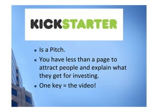 This document provides tips for pitching a business idea or product in 3 sentences or less. It emphasizes telling a compelling story that focuses on solving customers' problems. Key points include explaining the problem and solution in the first minute, demonstrating unfair advantages over competitors, showing an achievable business model and sales strategy, and focusing on the founding team's experience rather than technical details. The overall message is to grab attention quickly and communicate customer benefits simply.