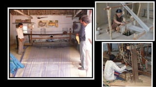 The document discusses different types of looms, focusing on the pit loom. It describes the pit loom as being invented in 1766 BC in Egypt, where the weaver would sit in a pit with their legs and use foot pedals to open the warp threads for the shuttle. The pit loom leaves the weaver's hands free to pass the shuttle across. It provides pictures and describes the basic structure of a pit loom, including components like the shuttle, shuttle box, warp beam, cloth roller, heddles, reed, and differences between throw shuttle and fly shuttle pit looms. Advantages are noted as producing texture and higher production than other early looms, while disadvantages include difficulty controlling many heddles and setting