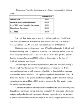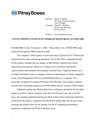 Pitney Bowes reported third quarter 2008 results with revenue increasing 3% to $1.5 billion and adjusted income from continuing operations of $139 million. On a GAAP basis, income from continuing operations was $100 million and net income was $98 million. Adjusted earnings per share were $0.67 compared to $0.63 in the prior year. For the full year, the company expects free cash flow to exceed $800 million and adjusted earnings per share between $2.75 to $2.82.