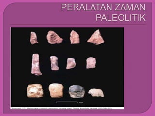 Dokumen ini membandingkan ciri-ciri masyarakat Zaman Paleolitik, Mesolitik, Neolitik dan Zaman Logam. Zaman Paleolitik adalah pemburu-pemungut yang nomad, menggunakan alat batu. Zaman Mesolitik hidup menetap dalam kelompok besar dan bercucuk tanam. Zaman Neolitik menyara hidup, mempunyai tembikar, dan alat batu lebih halus. Zaman Logam mula melebur logam dan mel