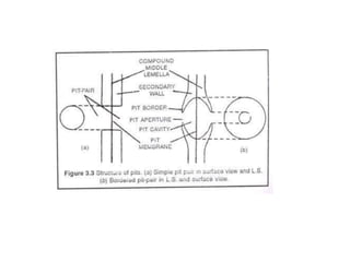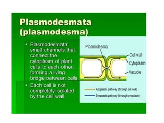 Plasmodesmata and pits allow communication between plant cells. Plasmodesmata connect adjacent cells and transport molecules, proteins, RNA and more to regulate processes. Pits are thinner areas of the cell wall that allow fluid and communication between neighboring cells. Pits have a pit chamber, aperture and membrane and come in variations like simple, bordered, half-bordered and blind pits. Both plasmodesmata and pits facilitate intercellular transport and communication in plants.