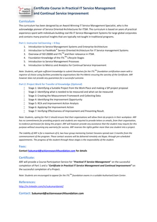 The document outlines a certificate course in practical IT service management and continual service improvement aimed at bridging the gap between theoretical knowledge and practical application in IT service delivery. It highlights the inefficacy of existing ITIL certification systems, which have resulted in skepticism regarding their ROI, while introducing a two-part curriculum that includes instructor-led learning and an optional project-based component. The course is designed by an expert in the field and focuses on developing practical skills in establishing service-oriented architecture for effective IT service management.