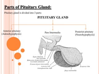 The pituitary gland is a small gland located at the base of the brain that regulates several important bodily functions. It is divided into anterior and posterior lobes. The anterior lobe secretes hormones that control other endocrine glands and regulate processes like growth, metabolism, and reproduction. These include growth hormone, thyroid stimulating hormone, and adrenocorticotropic hormone. The posterior lobe stores and releases oxytocin and vasopressin, which are produced in the hypothalamus and help regulate water balance and milk release. Disorders of the pituitary can impact hormone levels and cause wide-ranging symptoms.