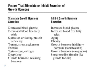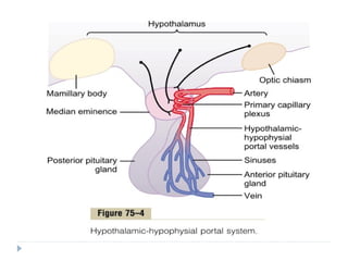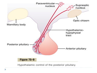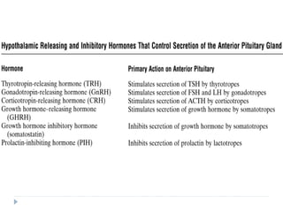 The document discusses the pituitary gland and its hormones. It describes the pituitary gland's location and connection to the hypothalamus. It then explains the six hormones of the anterior pituitary - growth hormone, ACTH, TSH, prolactin, FSH, and LH - and their roles in controlling metabolic functions. The two hormones of the posterior pituitary are ADH and oxytocin, which play roles in water balance and childbirth/lactation respectively. The hypothalamus controls pituitary secretion through releasing and inhibiting hormones.