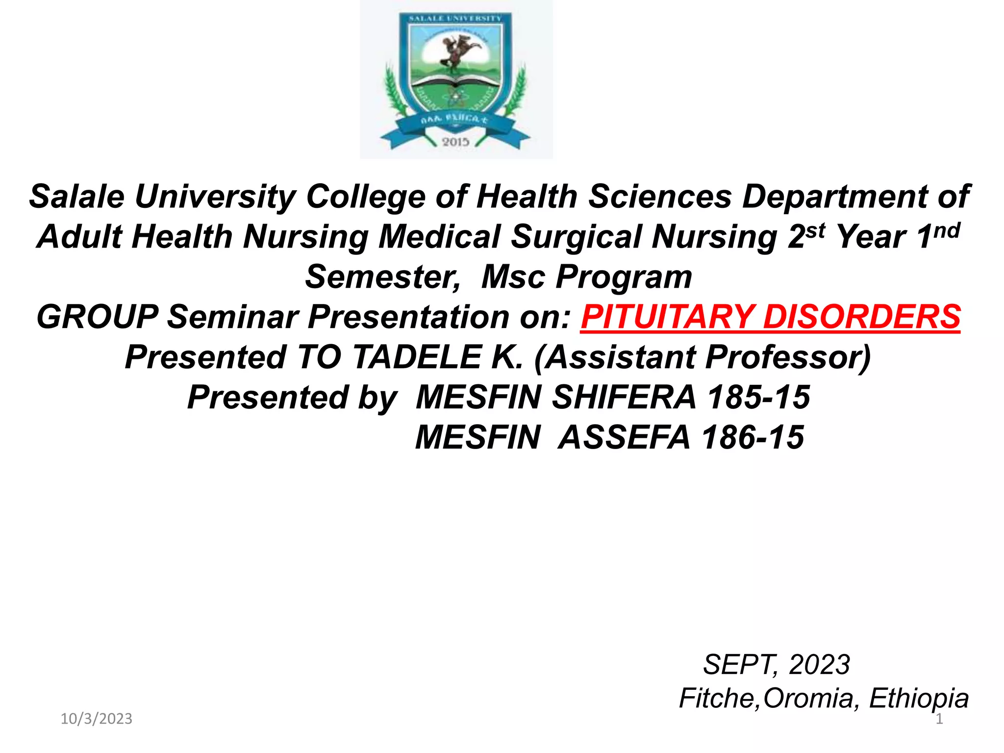 Pituitary disorders occur when there is too much or too little production of hormones by the pituitary gland. Some key pituitary disorders include hypopituitarism, hyperpituitarism, gigantism, acromegaly, and diabetes insipidus. Hypopituitarism is characterized by a loss of pituitary function and hormone deficiencies. Hyperpituitarism involves excessive hormone production and can manifest as gigantism in children or acromegaly in adults. Diabetes insipidus is caused by a deficiency or resistance to antidiuretic hormone, leading to excessive urination and thirst. These disorders are diagnosed through medical history, physical exams, imaging, and blood tests, and treatments aim to replace missing hormones