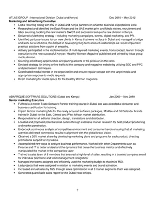 Pius Kamonye Kanja is a Kenyan national with over 12 years of experience in marketing, sales management, business development, and brand positioning. He has worked in various industries in both Kenya and the UAE, most recently as a Senior Account Manager for Atlas Group in Dubai where he exceeded sales targets. He holds a B.Com degree in Marketing and is pursuing a Postgraduate Diploma in Chartered Institute of Marketing.