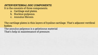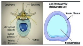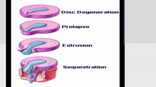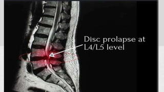 This document summarizes the components, pathology, diagnosis, clinical features, and treatment of a prolapsed intervertebral disc. It discusses the three components of the intervertebral disc - the cartilage end plates, nucleus pulposus, and annulus fibrosis. Pathology includes degeneration and displacement of the nucleus. Diagnosis involves imaging like CT and MRI. Clinical features commonly affect those aged 20-40 and include low back pain, sciatica, and neurological deficits. Treatment focuses on rest, medications, and physiotherapy including exercises and electrotherapy. Surgical options include fenestration, laminotomy, and laminectomy procedures.