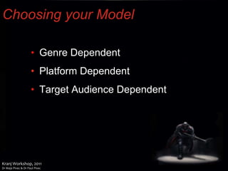 The document discusses various considerations for designing and implementing a game, including choosing a genre, platform, target audience, infrastructure, team, and engine. It also covers developing a business model, marketing strategies, and potential issues like repetitive levels that can lead to commercial failure if not addressed. The key takeaways are to do thorough research, test early and often, be professional, and believe in your ideas while learning from mistakes.