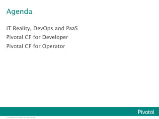 The document discusses Pivotal Cloud Foundry (CF) as a Platform as a Service (PaaS) aimed at enhancing developer and operator efficiencies. It highlights the importance of DevOps and Agile methodologies, outlining how Pivotal CF can streamline application deployment and management through features such as high availability, monitoring, and integrated services. Additionally, it emphasizes the impact of these technologies on organizational agility and operational success in a rapidly evolving IT landscape.