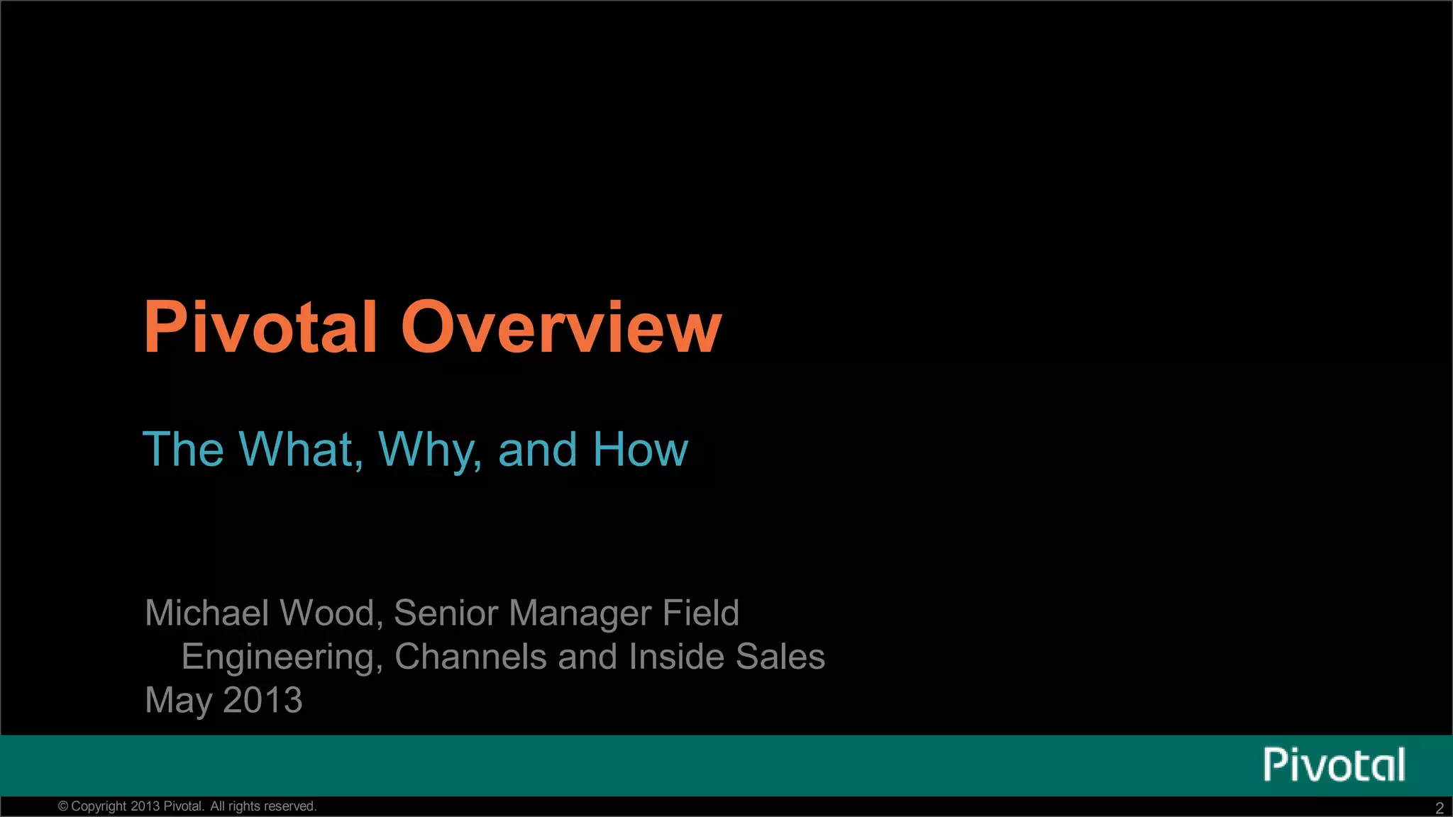 Pivotal is introducing a new unified data platform to enable companies to modernize using big data analytics, cloud computing, and agile development. The Pivotal data fabric provides a single solution for all data and analytics needs, from batch processing to real-time analytics. It is built on open source technologies like Hadoop and integrates products like Greenplum, Gemfire, and HAWQ to offer both SQL and NoSQL capabilities. The goal is to reduce complexity and costs while providing the scalability, portability, and data agility needed for modern consumer-grade applications.