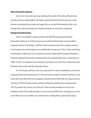 The document outlines Pixar's history, key elements of its business model, and its impact on the animation industry. It describes the company’s evolution from its beginnings in 1979 under George Lucas to becoming a subsidiary of Disney after a $7.4 billion acquisition in 2006. The key aspects discussed include customer segments, value propositions, distribution channels, key partners, and financial details, illustrating Pixar's successful approach to producing family-oriented animated films that resonate with audiences globally.