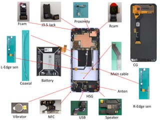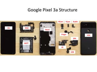 Tài liệu mô tả cấu trúc và các linh kiện bên trong của Google Pixel 3a, bao gồm cảm biến, chip bảo mật, và các thành phần điện tử khác. Nó liệt kê chi tiết các bộ phận và mã số sản phẩm của từng linh kiện, chủ yếu đến từ các nhà sản xuất nổi tiếng như Qualcomm và Bosch. Các thông số kỹ thuật và chức năng của từng linh kiện cũng được đề cập để cung cấp cái nhìn tổng quan về công nghệ trong thiết bị.