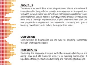 Pixel Advertising Solutions offers a comprehensive range of innovative advertising services, including multimedia branding, business consulting, and interior design, aimed at helping businesses achieve success. Their mission is to enhance client businesses through unique and effective advertising strategies while ensuring 100% customer satisfaction and delivering high-quality products on time. With a focus on flexibility and a robust client relationship, Pixel Advertising Solutions is positioned as a competitive advertising agency in Sri Lanka.