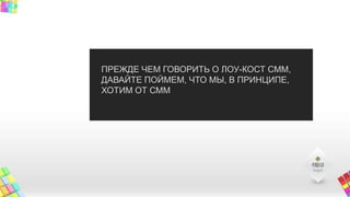 Документ обсуждает эффективные стратегии для лоу-кост SMM, акцентируя внимание на работе с лояльностью аудитории и демонстрации экспертизы вместо достижения прямых продаж. Упомянуто, что успешная SMM-кампания требует уникального контента и вовлечения профессионалов для создания креативного материала. Также представлен пример бюджета для создания SMM-стратегии, подчеркивающий важность постоянного взаимодействия с клиентами.