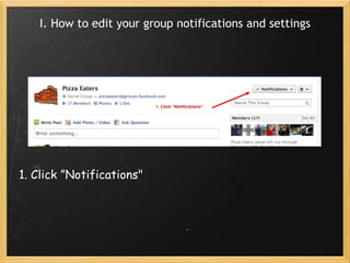 This document provides instructions for editing group notification settings on Facebook, finding panel questions within a Facebook group, and viewing Facebook account notifications. It explains how to click "Notifications" and "Settings" to choose notification preferences, find questions under the "Docs" section of a group, and view new notifications in the upper left corner of the Facebook site marked with a red bubble number. Contact information is provided for additional questions.