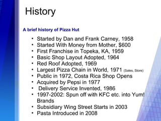 Pizza Hut was started in 1958 by brothers Dan and Frank Carney in Wichita, Kansas with $600 from their mother. By 1971, Pizza Hut had become the largest pizza chain in the world. It was publicly traded in 1972 and was acquired by PepsiCo in 1977. Pizza Hut introduced delivery service in 1986 and pasta in 2008. Today, Pizza Hut operates over 9,000 locations worldwide as a subsidiary of Yum! Brands.