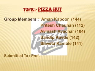 Pizza Hut is an American restaurant chain that offers different styles of pizza, salad, pasta, wings and more. Founded in 1958 in Kansas, it now has over 6,000 locations in the US and over 5,000 internationally. Pizza Hut's mission is to be the best pizza for every occasion, and its vision is to make eating items easily available with minimum effort besides cost. It uses Porter's Five Forces model and follows a global strategy while acting locally.